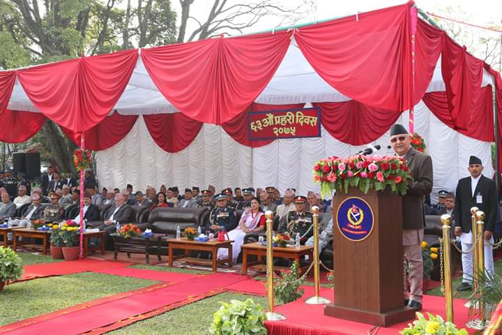 प्रहरी दिवसको अवसरमा समस्त प्रहरी कर्मचारी तथा सेवानिवृत्त प्रहरी कर्मचारीहरुलाई शुभकामना दिनुहुँदै प्रधानमन्त्री ओलीले इतिहासका विभिन्न कालखण्डमा अनेक चुनौति सामना गर्दै नागरिकलाई सुरक्षाको अनुभूति दिलाउन संगठनका कर्मठ सदस्यहरुले निर्वाह गरेको भूमिका उल्लेखनीय र इतिहासका पानाको साथै हरेक नागरिकको ह्रदयमा कहिल्यै नमेटिने गरी अंकित भएको बताउनुभयो । उहाँले कर्तव्यपथमा अग्रसर रहँदा जीवन आहुति दिने वीर, अमर प्रहरीहरुप्रति भावपूर्ण श्रद्धाञ्जली व्यक्त गर्नुको साथै परिवारजनहरुप्रति सम्मान र घाइते हुनुभएका प्रहरी कर्मचारीहरुको शीघ्र स्वास्थ्य लाभको कामना गर्नुभयो ।