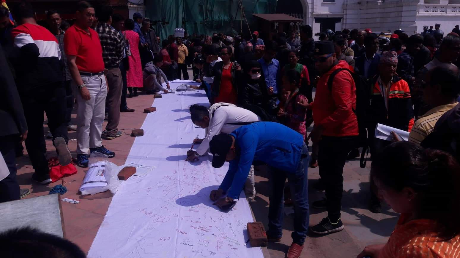 राप्रपाले आज ७७ वटै जिल्लामा हिन्दु राष्ट्र पुनःस्थापना हस्ताक्षर अभियान सञ्चालन गरेको छ । हिन्दु राष्ट्र कायम गरिनुपर्ने, राजा सहितको लोकतन्त्र स्थापनाका लागि गोलमेच सम्मेलन हुनुपर्ने, संघीयता बारे जनमतसंग्रह गरिनुपर्ने लगायतका २२ बुँदे माग राखी गत फागुन ७ गते प्रधानमन्त्रीलाई ज्ञापनपत्र बुझाइ जनसंघर्ष कार्यक्रमको घोषणा गरेको थियो ।
