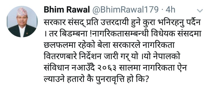 ‘सरकार संसदप्रति उत्तरदायी हुने कुरा भनिरहनु पर्दैन’, रावलले सरकारले संसदको सर्वोच्चता भुलेको निष्कर्षका साथ ट्वीटरमा लेखेका छन्, ‘तर बिडम्बना, नागरिकतासम्बन्धी विधेयक संसदमा छलफलमा रहेका बेला सरकारले नागरिकता वितरणबारे निर्देशन जारी ग¥यो । यो नेपालको संविधान नआउँदै २०६३ सालमा नागरिकता ऐन ल्याउने हतारोकै पुनरावृत्ति हो कि ?’