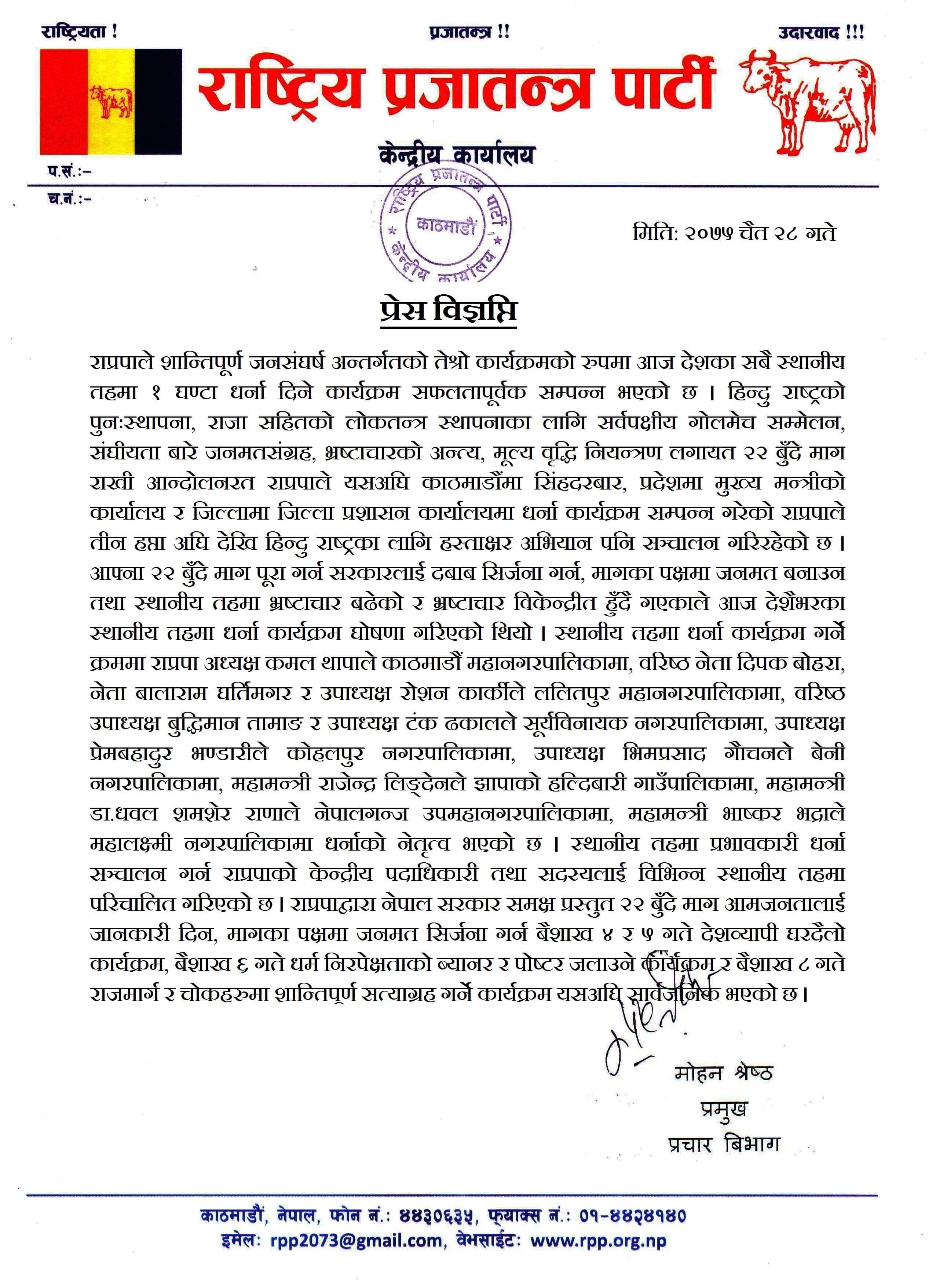 राप्रपाले आफ्ना २२ बुँदे माग पूरा गर्न सरकारलाई दबाब सिर्जना गर्न, मागका पक्षमा जनमत बनाउन तथा स्थानीय तहमा भ्रष्टाचार बढेको र भ्रष्टाचार विकेन्द्रीत हुँदै गएकाले आज देशैभरका स्थानीय तहमा धर्ना कार्यक्रम घोषणा गरिएको थियो ।