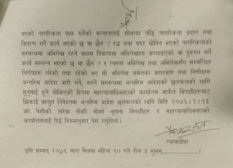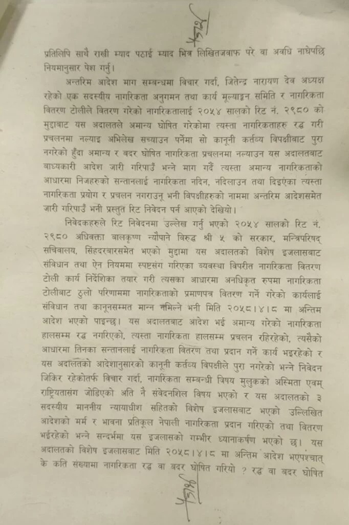 मंगलबार न्यायाधीश प्रकाशमानसिंह राउतको एकल इजलासले ०५४ सालमा कानूनविपरीत वितरण भएको ठहरिएको र सर्वोच्च अदालतको खारेज गर्न आदेश दिएको नागरिकता खारेज नगर्नुको कारण १५ दिनभित्र पेश गर्न आदेश दिएको हो ।