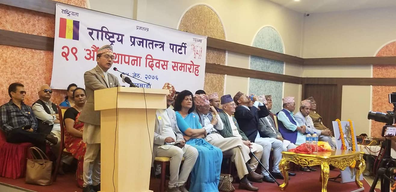 पार्टीको २९औं स्थापना दिवसको अवसरमा आयोजित कार्यक्रमलाई सम्बोधन गर्दै अध्यक्ष थापाले राजादेखि विप्लव माओवादी सम्म सबै अटाउने नेपाली संस्करणको मौलिक प्रजातन्त्र निर्माण गर्नेबारे बहस शुरु गर्नुपर्ने समय आइसकेको बताउँदै कसैलाई निषेधित गरिँदा लोकतन्त्रमाथि खतरा भइरहने भएकोले यसतर्फ सचेत रहन सबै राजनैतिक दलहरुलाई आग्रह गर्नुभयो ।