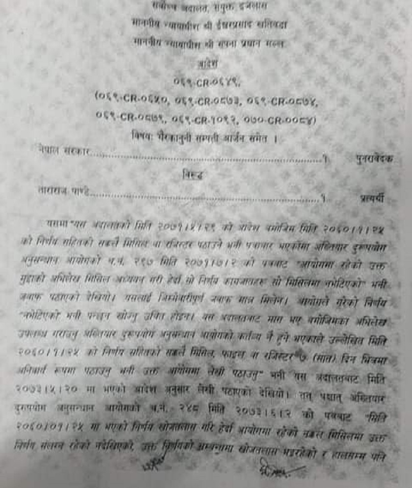 सर्वोच्च अदालतमा मुद्दा विचाराधीन अवस्थामै रहेको बेला २०७१ साल भदौ २९ गते सर्वोच्च अदालतले अख्तियारलाई सक्कल मिसिल उपलब्ध गराउन आदेश दिएको थियो ।