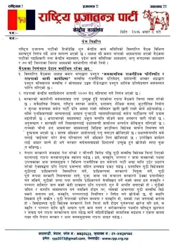 यस्तै संगठित र योजनाबद्ध तरिकाले धर्म परिवर्तन भइरहेकोमा पनि विस्तारित बैठकले चिन्ता व्यक्त गरेको छ। राप्रपाले सरकारलाई बुझाएको २२ बुँदे माग पूरा नभए दोस्रो चरणको संघर्ष सुरु गर्ने चेतावनी दिएको छ।