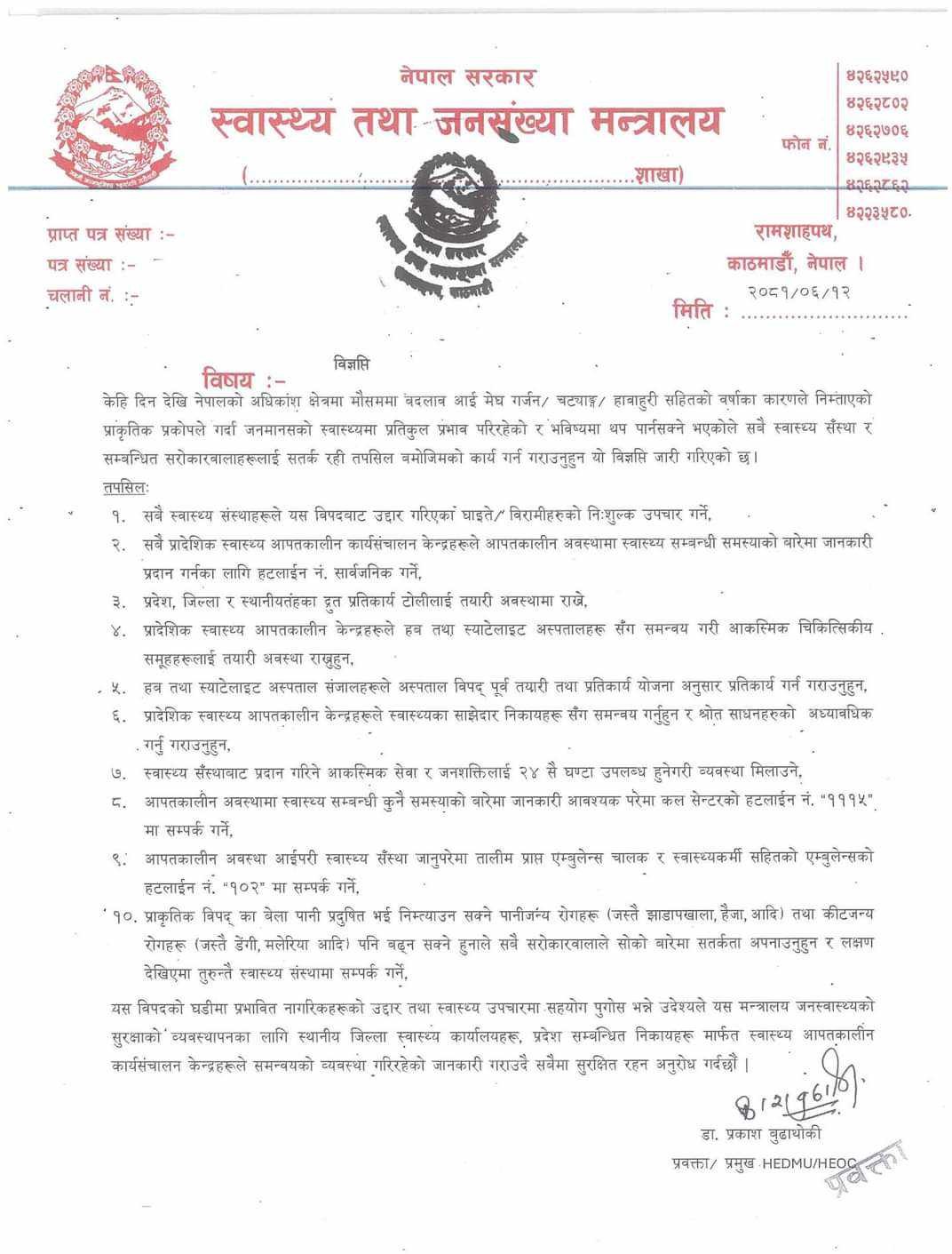 जारी विज्ञप्तिमा केही दिन देखि नेपालको अधिकांश क्षेत्रमा मौसममा बदलाव आई मेघ गर्जन, चट्याङ्ग र हावाहुरी सहितको वर्षाका कारणले निम्ताएको प्राकृतिक प्रकोपले जनमानसको स्वास्थ्यमा प्रतिकुल प्रभाव परेको र भविष्यमा थप पार्न सक्ने भएकोले सबै स्वास्थ्य संस्था र सम्बन्धित सरोकारवालाहरूलाई सतर्क रही उपचारमा सहयोग गर्न आग्रह गरिएको छ ।