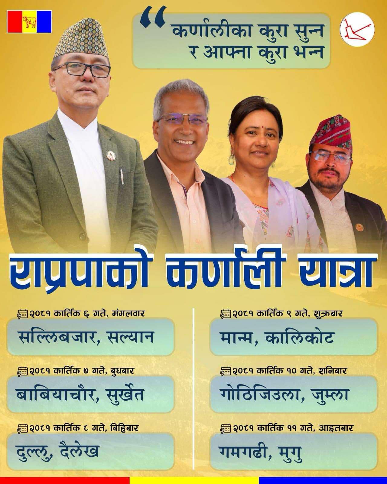 मंगलबारदेखि सूरु कर्णाली यात्रामा ‘कर्णालीका कुरा सुन्न र आफ्ना कुरा भन्न’ भन्ने उदघोषका साथ राप्रपाका केन्द्रीय तहका नेताहरु कर्णालीमा सक्रिय छन् ।