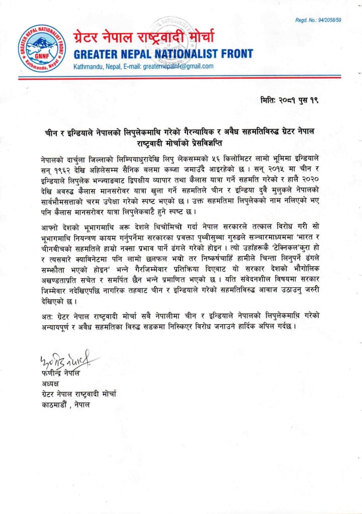 चीन र इन्डियाले नेपालको लिपुलेकमाथि गरेको गैरन्यायिक र अवैध सहमतिविरुद्ध ग्रेटर नेपाल राष्ट्रवादी मोर्चाको प्रेसविज्ञप्ति