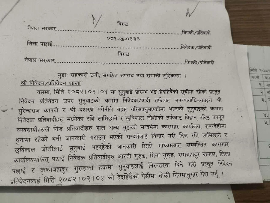 सहकारी ठगी, संगठित अपराध तथा सम्पत्ति शुद्धीकरण मुद्दाका दुवै पक्षले कास्की जिल्ला अदालतको आदेश खारेजको माग गर्दै उच्च अदालत पोखरामा निवेदन दिएका हुन् । त्यसमाथि बिहीबारबाट सुनुवाइ प्रारम्भ भएको छ । सुनुवाइलाई उच्च अदालतले प्राथमिकता दिँदै हेर्दाहेर्दैमा राखेको छ ।