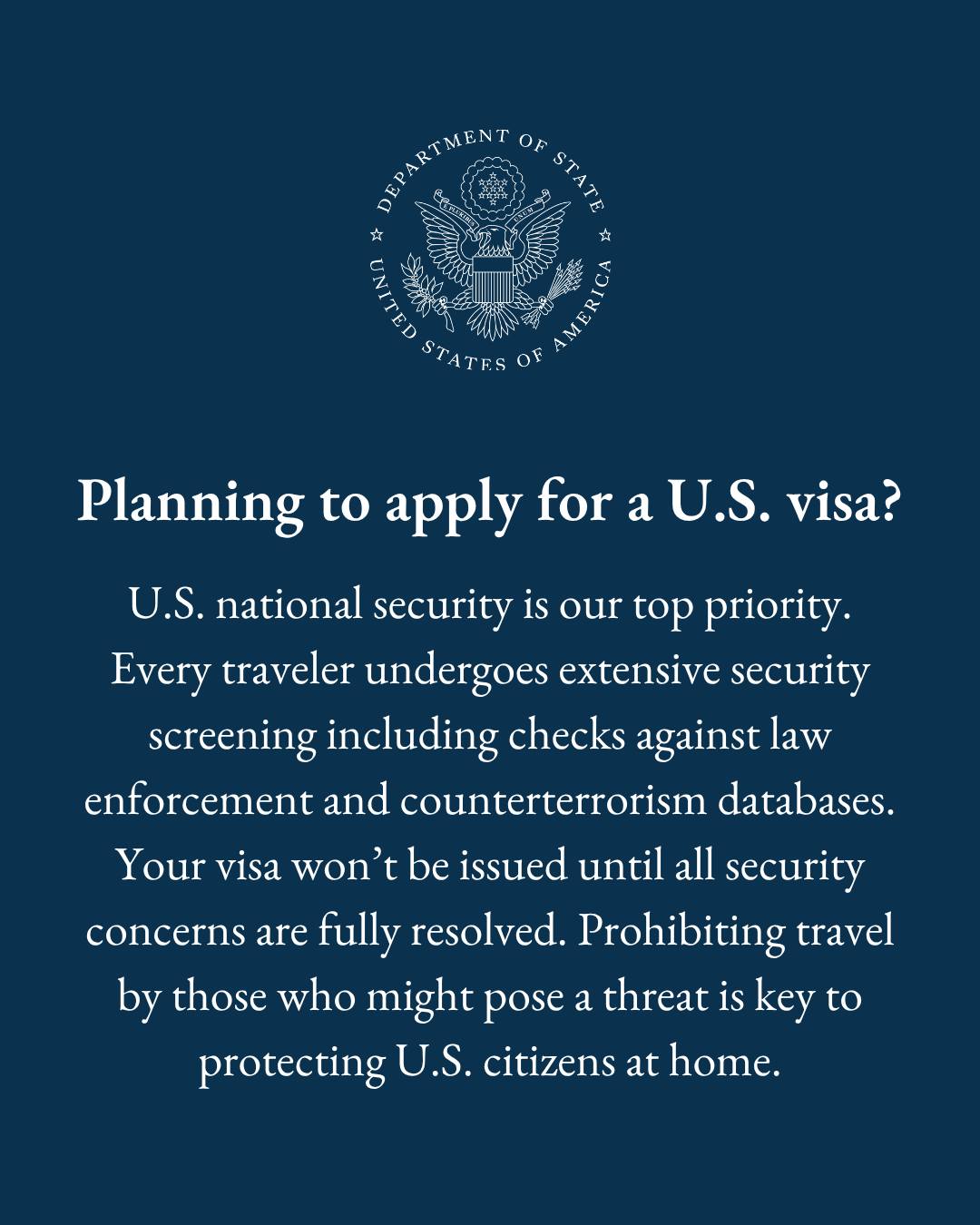 दूतावासको सूचनामा भनिएको छ, “प्रत्येक यात्रुले कडा सुरक्षा जाँच प्रक्रियाबाट जानुपर्नेछ, जसमा कानुन कार्यान्वयन निकायका रेकर्ड तथा आतंकवादविरोधी डाटाबेसमा नाम जाँच पनि समावेश हुनेछ। सबै सुरक्षा जाँचहरू पूर्ण रूपमा समाधान नभएसम्म तपाईंको भिसा जारी हुनेछैन।”