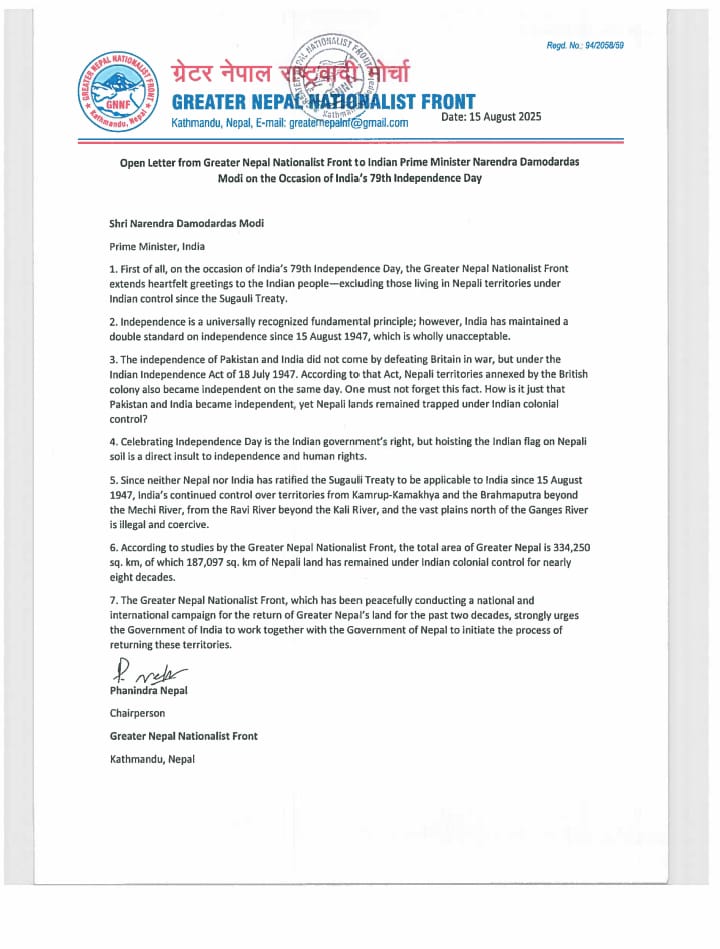 Kathmandu . On the occasion of India’s 79th Independence Day, the Greater Nepal Nationalist Front (GNNF) has sent an open letter to Indian Prime Minister Narendra Damodardas Modi, demanding the return of Nepali territories said to be under Indian control since the Sugauli Treaty.