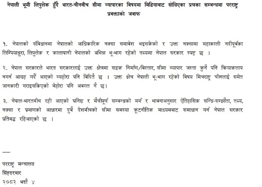 नेपालले आफ्नो संविधानमा आधिकारिक नक्सा समावेश गर्दै महाकाली नदीपूर्वको भूभागलाई नेपालको अभिन्न अंग घोषणा गरिसकेको हो। त्यस्तै, परराष्ट्र मन्त्रालयले जारी गरेको तीन बुँदे विज्ञप्तिमा भारतलाई सो क्षेत्रमा कुनै पनि गतिविधि नगर्न आग्रह गर्दै चीनलाई समेत जानकारी गराइएको स्पष्ट उल्लेख छ। विज्ञप्तिमा भनिएको छ, “नेपाल–भारतबीचको घनिष्ठ र मैत्रीपूर्ण सम्बन्धको मर्मअनुसार सीमा समस्या संवाद र कूटनीतिक माध्यमबाट समाधान गर्न नेपाल प्रतिबद्ध छ।” तर, यो भन्दा टाढा सरकारले कुनै ठोस कूटनीतिक दबाब दिन सकेको देखिँदैन।