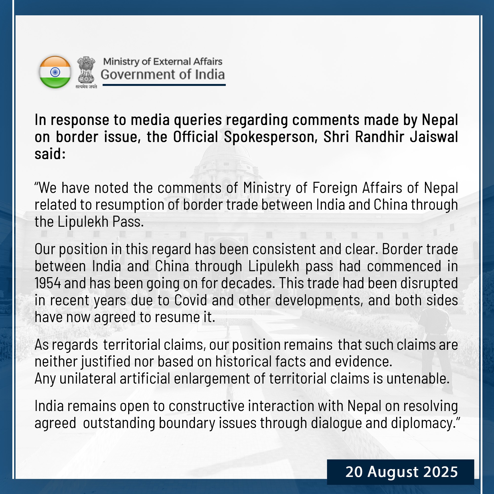 भारतले नेपालको दाबीलाई नक्कली र प्रमाणविहीन भन्दै अस्वीकार गरिसकेको छ। भारतीय परराष्ट्र मन्त्रालयका प्रवक्ता रणधीर जैसवालले लिपुलेकमार्ग हुँदै हुने व्यापार १९५४ यता चल्दै आएको भन्दै नेपालले गरेको भू–दाबी ऐतिहासिक आधारविहीन भएको टिप्पणी गरेका छन्। चीन पनि भारतसँगको सहमतिको सन्दर्भमा नेपाललाई जानकारी दिनै आवश्यक ठानेन। यसरी दुई ठूला छिमेकीले नेपालकै भूमि प्रयोगबारे सम्झौता गर्दा नेपाललाई बाईपास गर्नु सानो चुनौती होइन, तर ठूला दल र नेतृत्वको मौनता अझै गम्भीर प्रश्न बनेको छ।