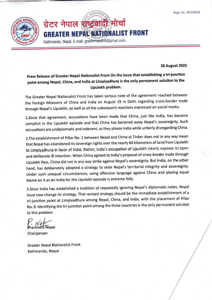 काठमाडौँ । इन्डिया र चीनबीच १९ अगस्ट (०८२ भाद्र ३) मा दिल्लीमा भएको लिपुलेक मार्गमार्फत सीमापार व्यापारको सहमतिप्रति ग्रेटर नेपाल राष्ट्रवादी मोर्चाले गम्भीर ध्यानाकर्षण गराएको छ ।