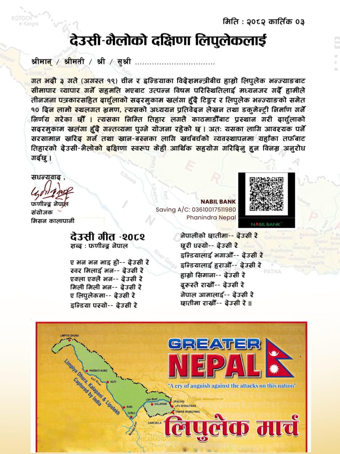 लिपुलेक आन्दोलनका संयोजक फणीन्द्र नेपालले यसलाई “देउसी–भैलोको दक्षिणा लिपुलेकलाई” भन्ने अभियानका रूपमा अघि सारेका छन् ।