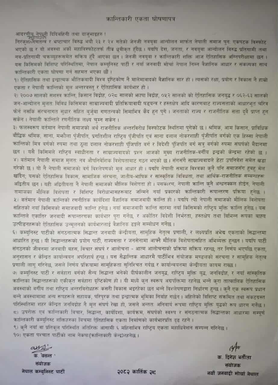 काठमाडौं । वसन्तको नेतृत्वमा रहेको नेपाल कम्युनिस्ट पार्टी र दिनेश बर्तौलाको नेतृत्वमा रहेको नयाँ जनवादी मोर्चा नेपाल बीच ऐतिहासिक एकता सम्पन्न भएको छ ।