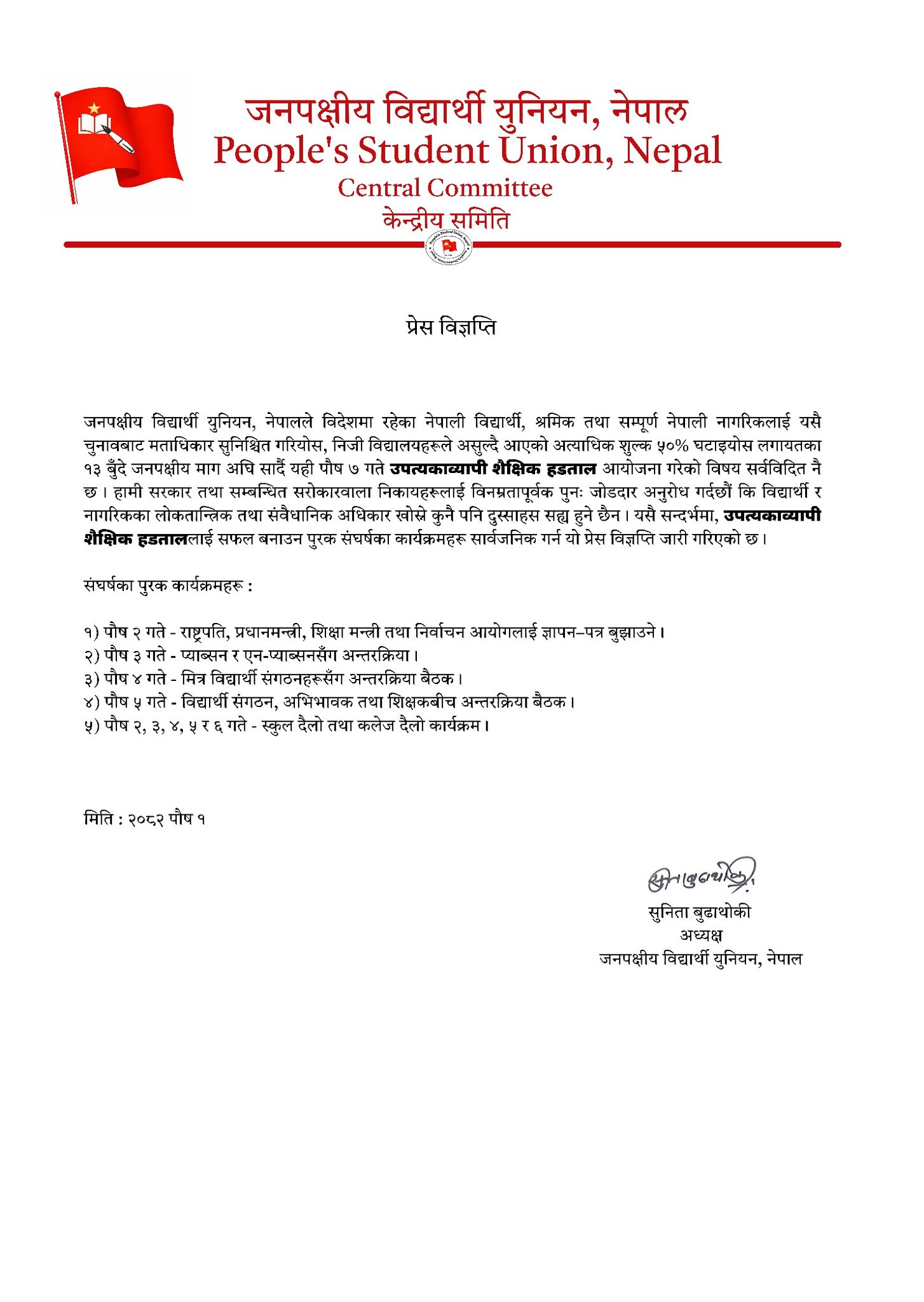 १) पौष २ गते – राष्ट्रपति, प्रधानमन्त्री, शिक्षा मन्त्री तथा निर्वाचन आयोगलाई ज्ञापनपत्र बुझाउने ।