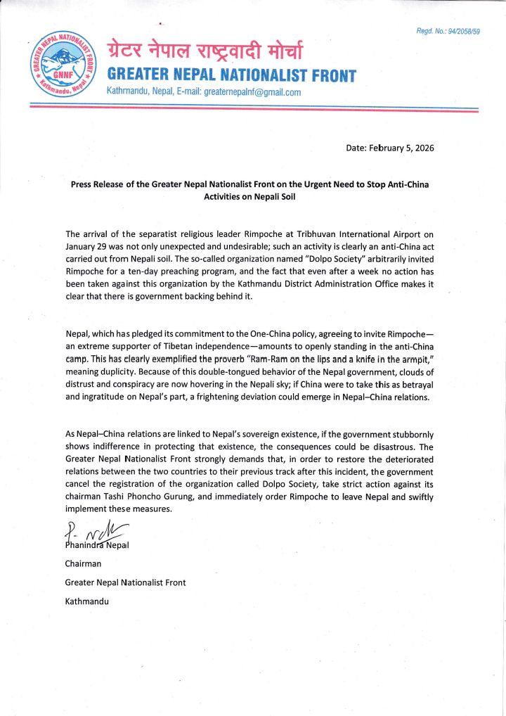 ग्रेटर नेपाल नेशनलिस्ट फ्रन्टले नेपाल सरकारको व्यवहारलाई दोहोरो चरित्रको संज्ञा दिँदै यसले नेपाल–चीन सम्बन्धमा गम्भीर अविश्वास पैदा गरिरहेको चेतावनी दिएको छ । विज्ञप्तिमा भनिएको छ, यदि चीनले यस घटनालाई नेपालको विश्वासघातका रूपमा व्याख्या गर्यो भने दुई देशबीचको सम्बन्धमा गम्भीर विचलन आउन सक्ने खतरा रहेको छ ।